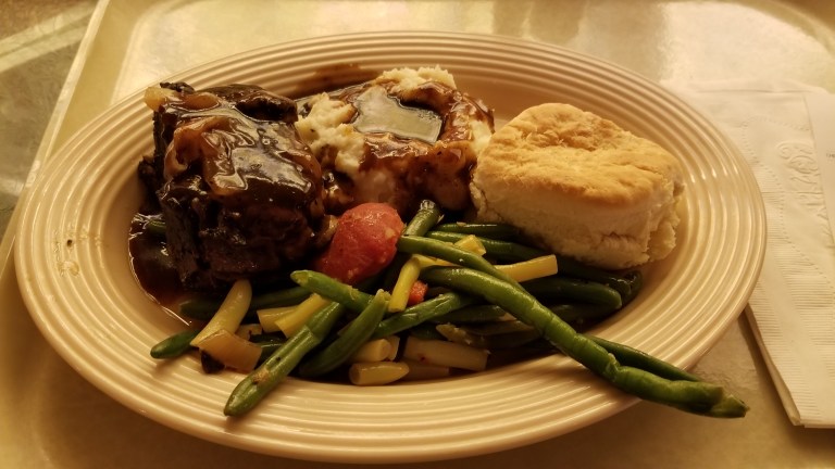 Disneyland is one of my favorite places to visit. One of my favorite things to do at Disneyland is eat. You can grab a quick bite or have a super fancy dinner. I wanted to treat my husband and I one night and decided to have dinner at the Plaza Inn on Mainstreet. If you want comfort food, this is the place to go to. One of their signatures plates is their chicken plate. Their chicken plate comes with enough chicken for two people, mash potatoes with gravy, yummy veggies and a fresh baked biscuit. Not gonna lie, Disneyland loves cooking from scratch. The chicken is yummy but that night when we had dinner I got the pot roast. If you’ve never had the pot roast, please try it. You won’t regret it. The meat is tender and juicy and the gravy is a perfect addition. They add the gravy to the potatoes and it’s super yummy. May I add, it’s an awesome place to have dinner at, the inside of the restaurant is super cool. They also have dessert, so save some room.